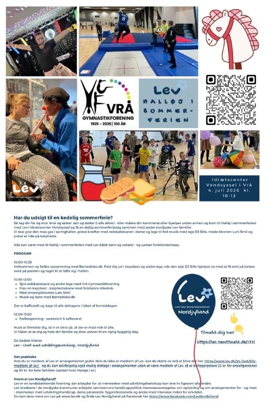 Har du udsigt til en kedelig sommerferie? Så tag din far og mor, bror og søster, søn og datter (i alle aldre) - eller måske din kammerat eller hjælper under armen og kom til Halløj i sommerferien med Lev i Idrætscenter Vendsyssel og få en dejlig sommerferiedag sammen med andre nordjyske Lev-familier.