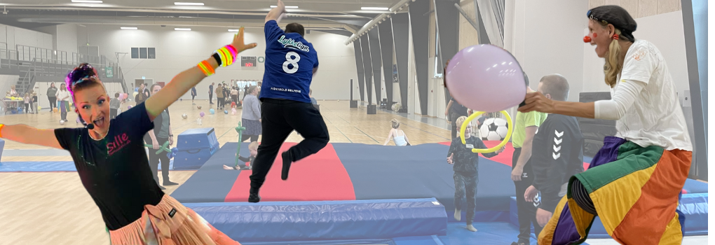 Vi skal give den max gas i springhallen, spille fodbold, prøve kræfter med redskabsbanen, danse og lege til fed musik med seje DJ Sille, møde klovnen Luni Smil og prøve at ride på kæpheste.