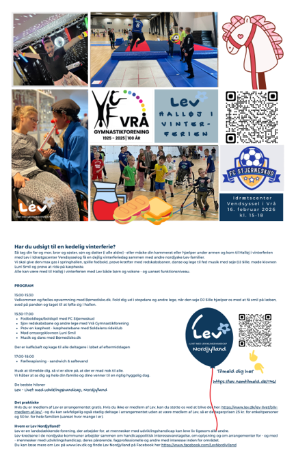 Har du udsigt til en kedelig vinterferie? Så tag din far og mor, bror og søster, søn og datter (i alle aldre) - eller måske din kammerat eller hjælper under armen og kom til Halløj i vinterferien med Lev i Idrætscenter Vendsyssel og få en dejlig vinterferiedag sammen med andre nordjyske Lev-familier.